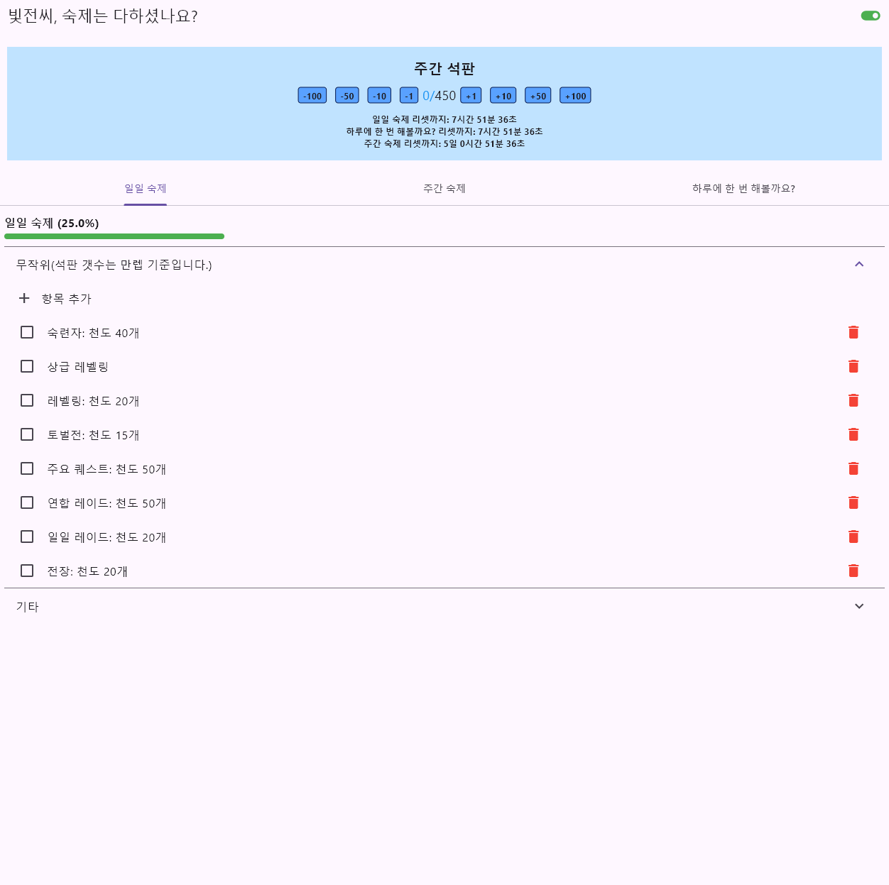 일일 숙제와 하루에 한 번 해볼까요? 탭들의 항목은 매일 자정에 자동으로 리셋되며, 주간 숙제와 주간 석판은 매주 화요일 오후 5시에 리셋 됩니다.
